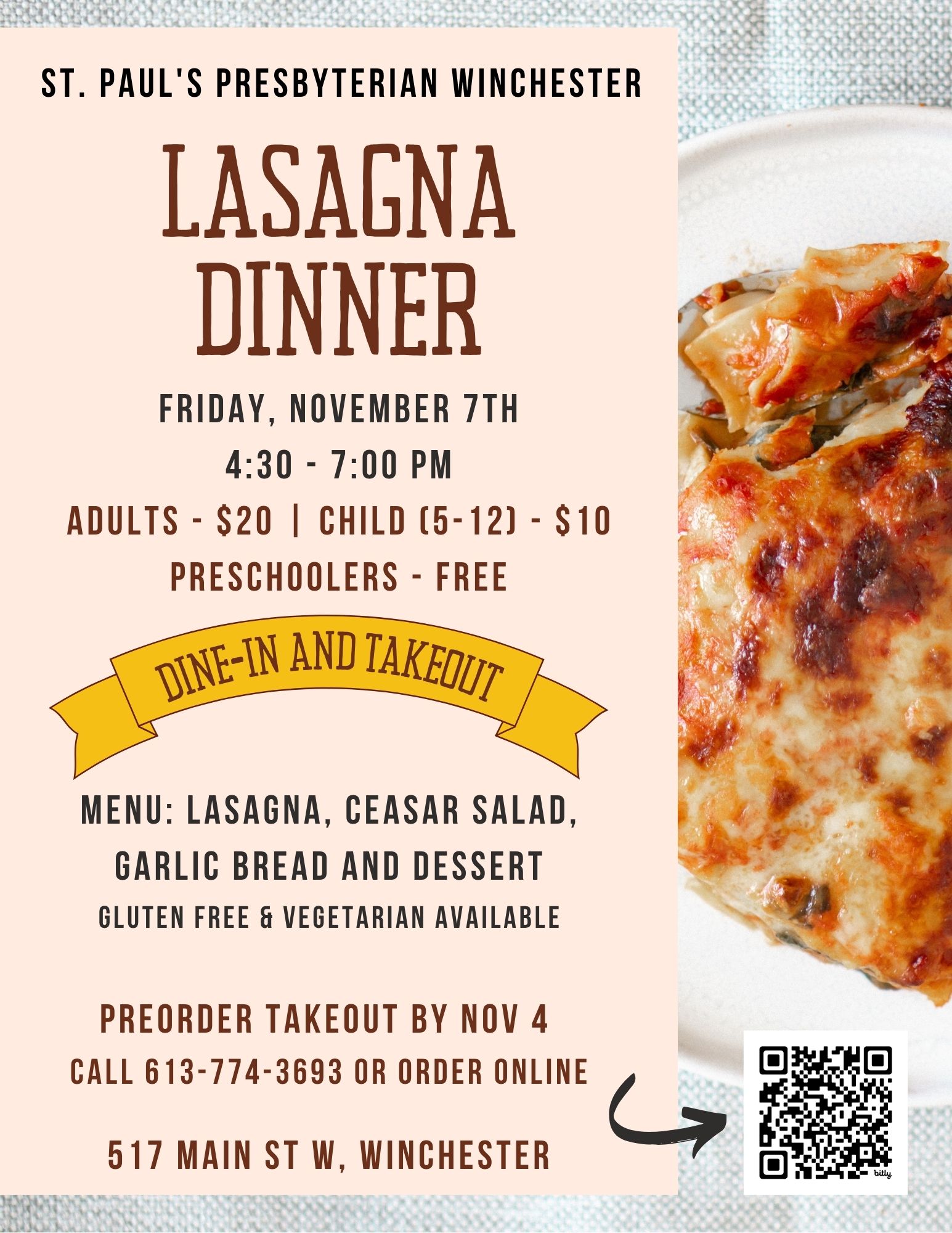 With fall harvest in full swing, we will be hosting our 3rd annual lasagna dinner with pick-up and takeout options. Offering traditional, vegetarian and gluten free lasagna options along with garlic bread, caesar salad and dessert.
